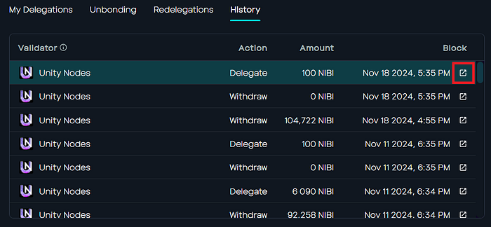 In the history tab we should find our last transaction with the Delegate action where we delegated our amount of tokens.